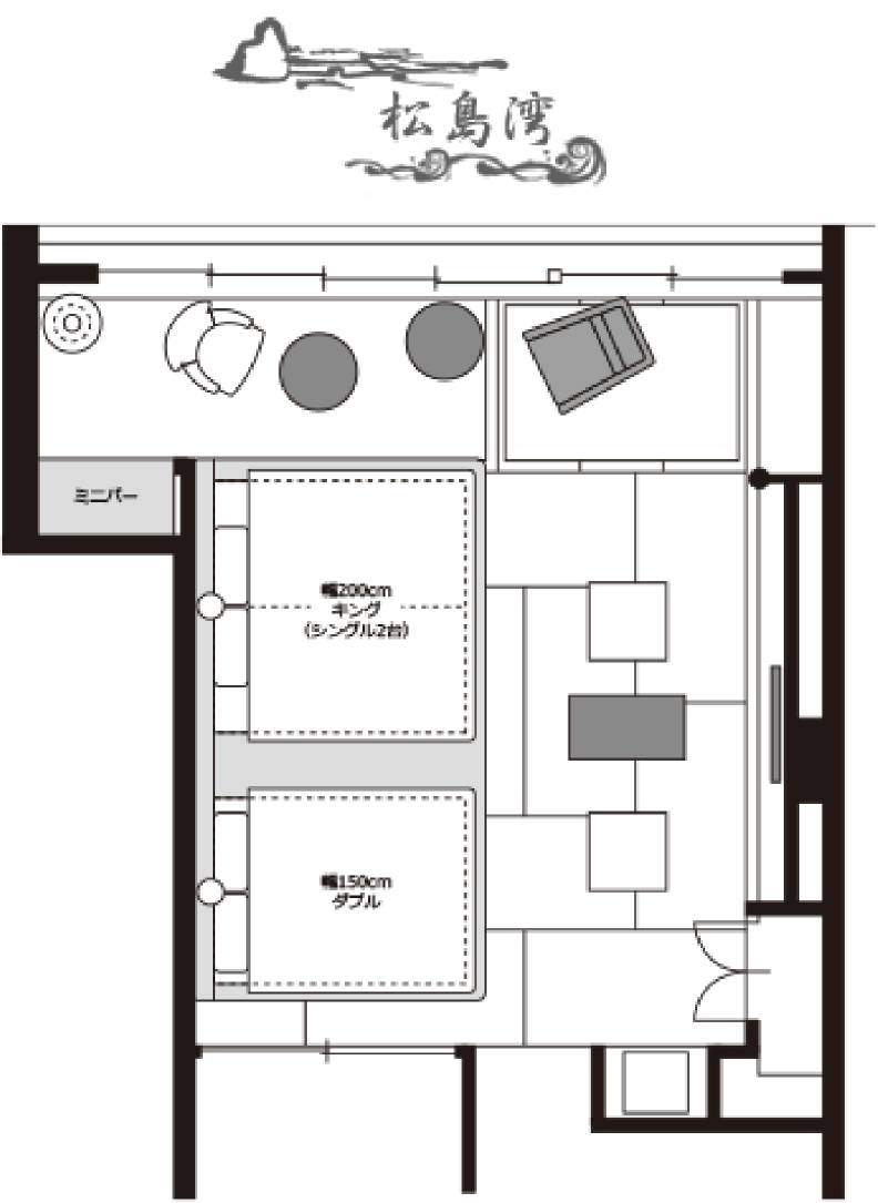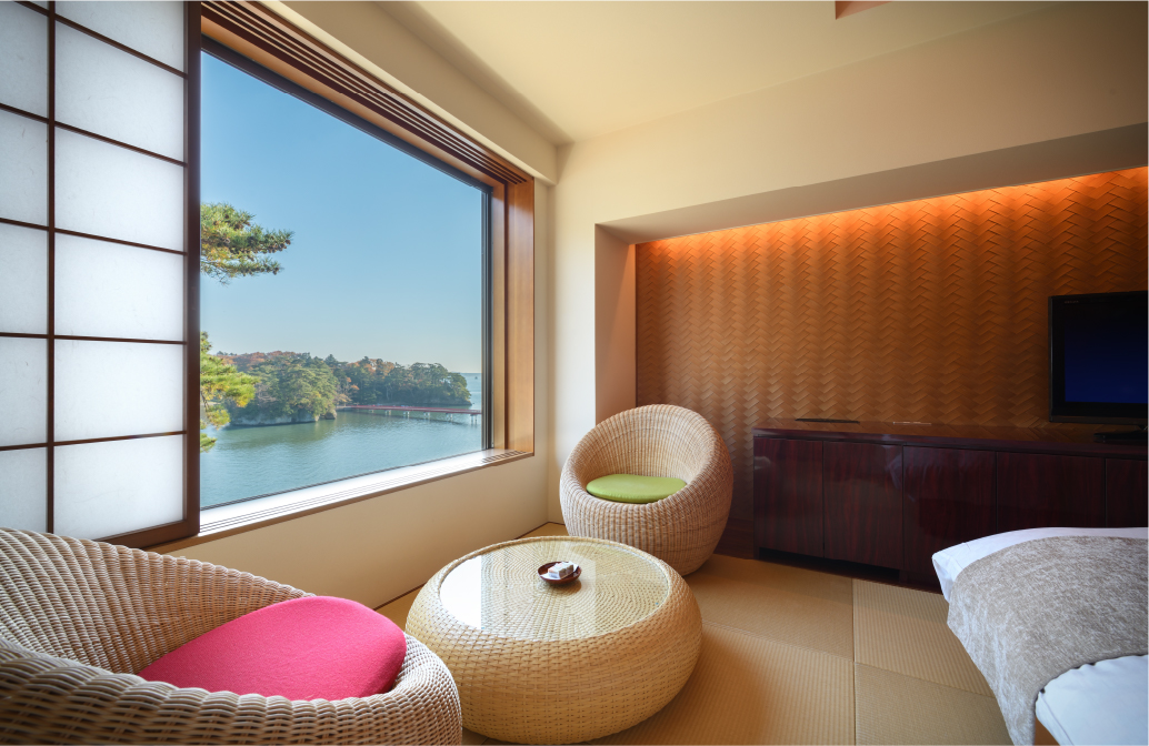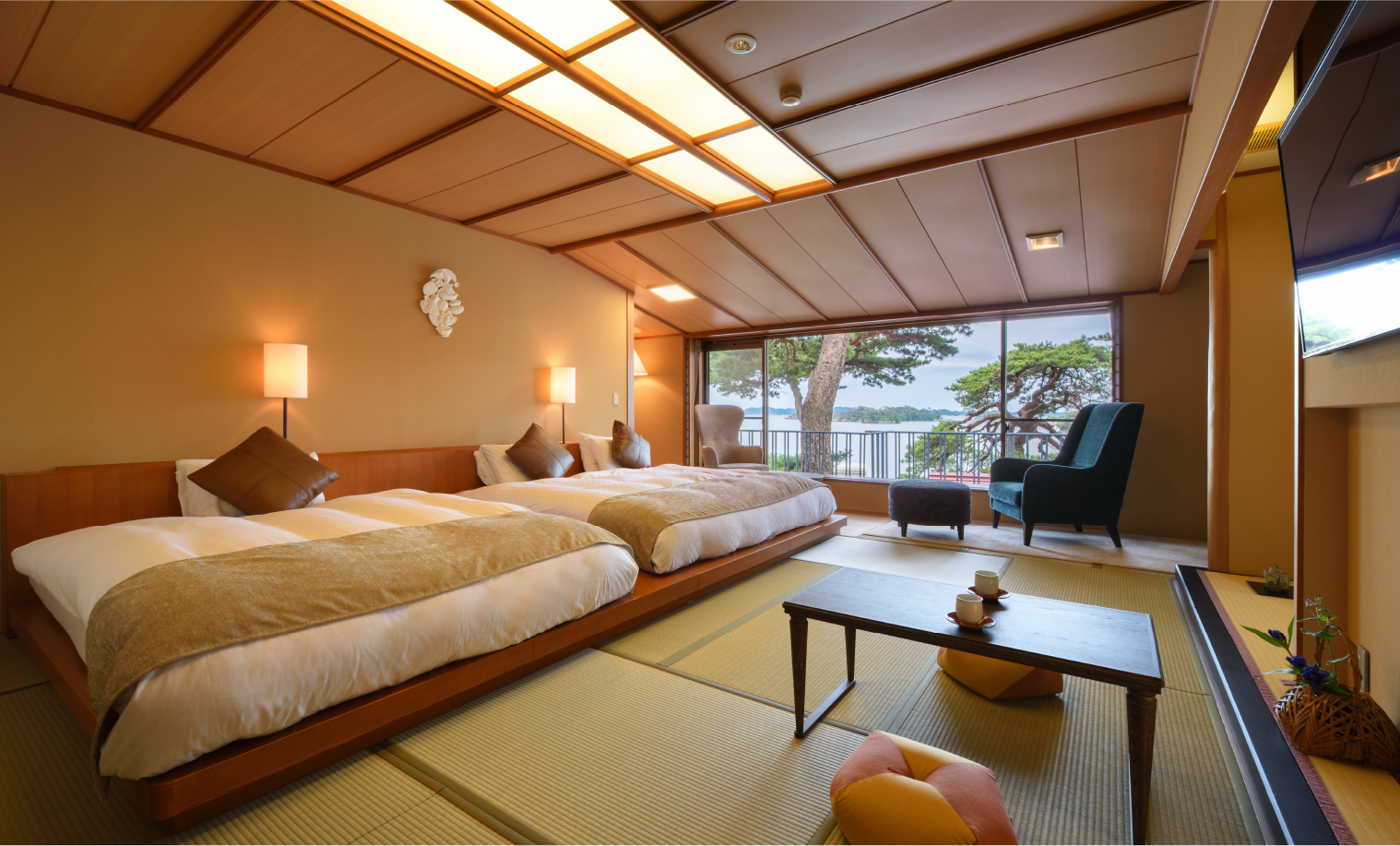 和室12.5帖(ツインまたはトリプルベッド)キングベッド幅は98cmのシングルベッド2つに、4名様ご利用時にはエキストラベッドを設置 / 各種お飲み物を揃えたお洒落なミニバー / 大窓から松島湾を見渡すパノラマビュー / AD CORE 瀬戸 昇 氏プロデュースのオリジナルインテリア / 50型4Kテレビ / 洗面台 / 温水洗浄便座付トイレ / 空気洗浄機 / ドライヤー / インターネット接続可能