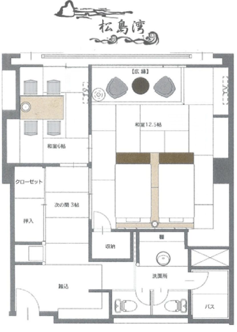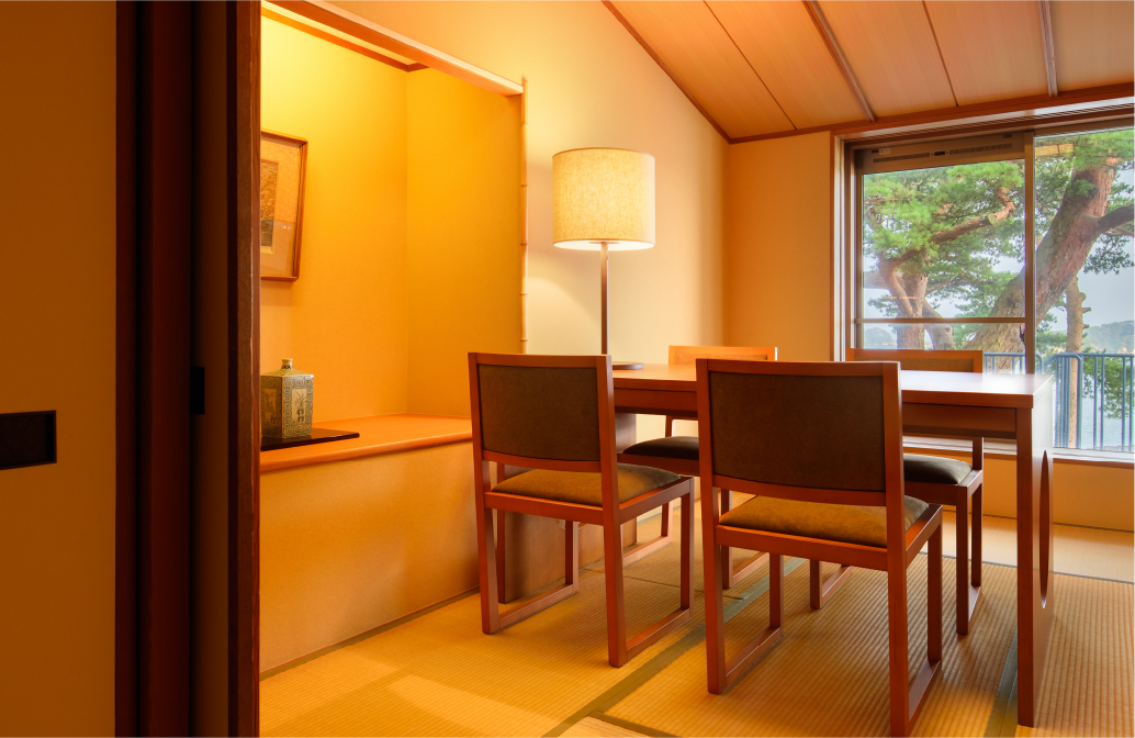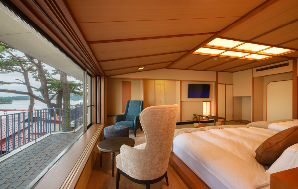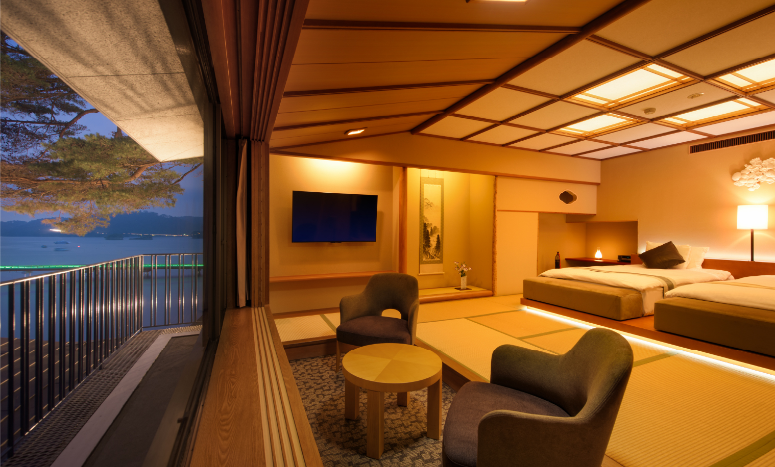 和室12.5帖(ツインベッド)+和室6帖+副室3帖 / 大窓から松島湾を見渡すパノラビュー / AD CORE 瀬戸 昇 氏プロデュースのオリジナルインテリア / 50型4Kテレビ / BOSE製CDプレーヤー / シモンズ製ダブルベッド / 照度調整機能付照明 / 洗面台 / 温水洗浄便座付トイレ / 空気洗浄機 / ドライヤー / インターネット接続可能