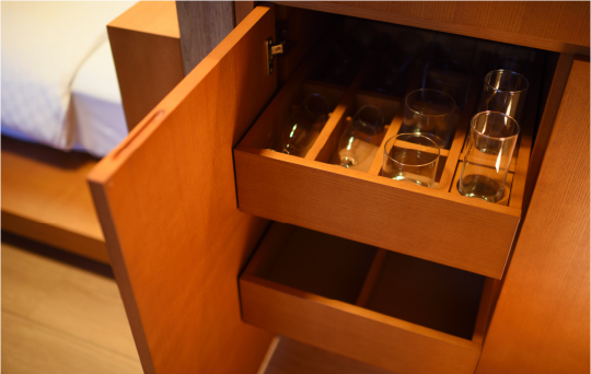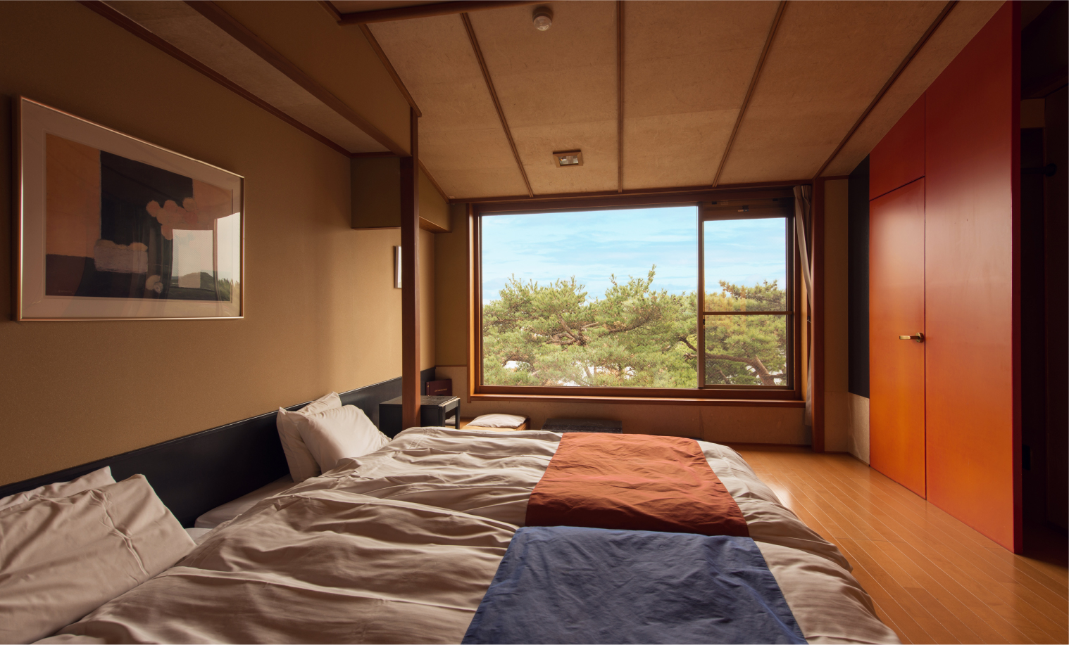 色々なベッドアレンジでさまざまな使い方が出来る二人静(ふたりしずか)。キングベッド&ダブルベッドが和のテイストをベースにしながら、これまでにない上質な寛ぎをお約束します。海を見ながら、最上級のゆったり時間をお楽しみください。