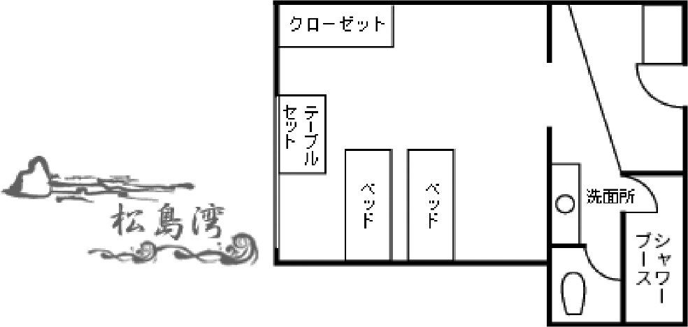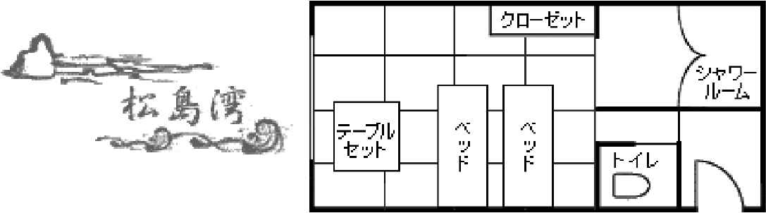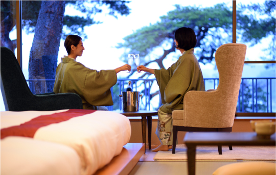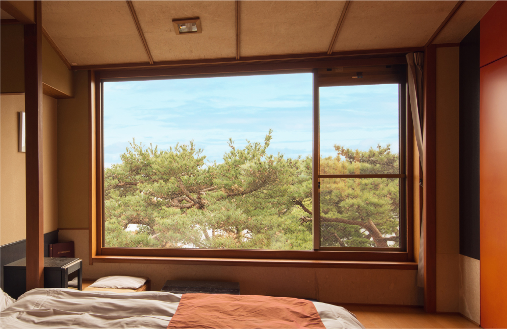 洋風客室27㎡ / FUTON-BED / 海と松を臨むテーブルコーナー / 洗面台 / 温水洗浄便座付トイレ / シャワーブース/ 空気洗浄機 / ドライヤー /インターネット接続可能