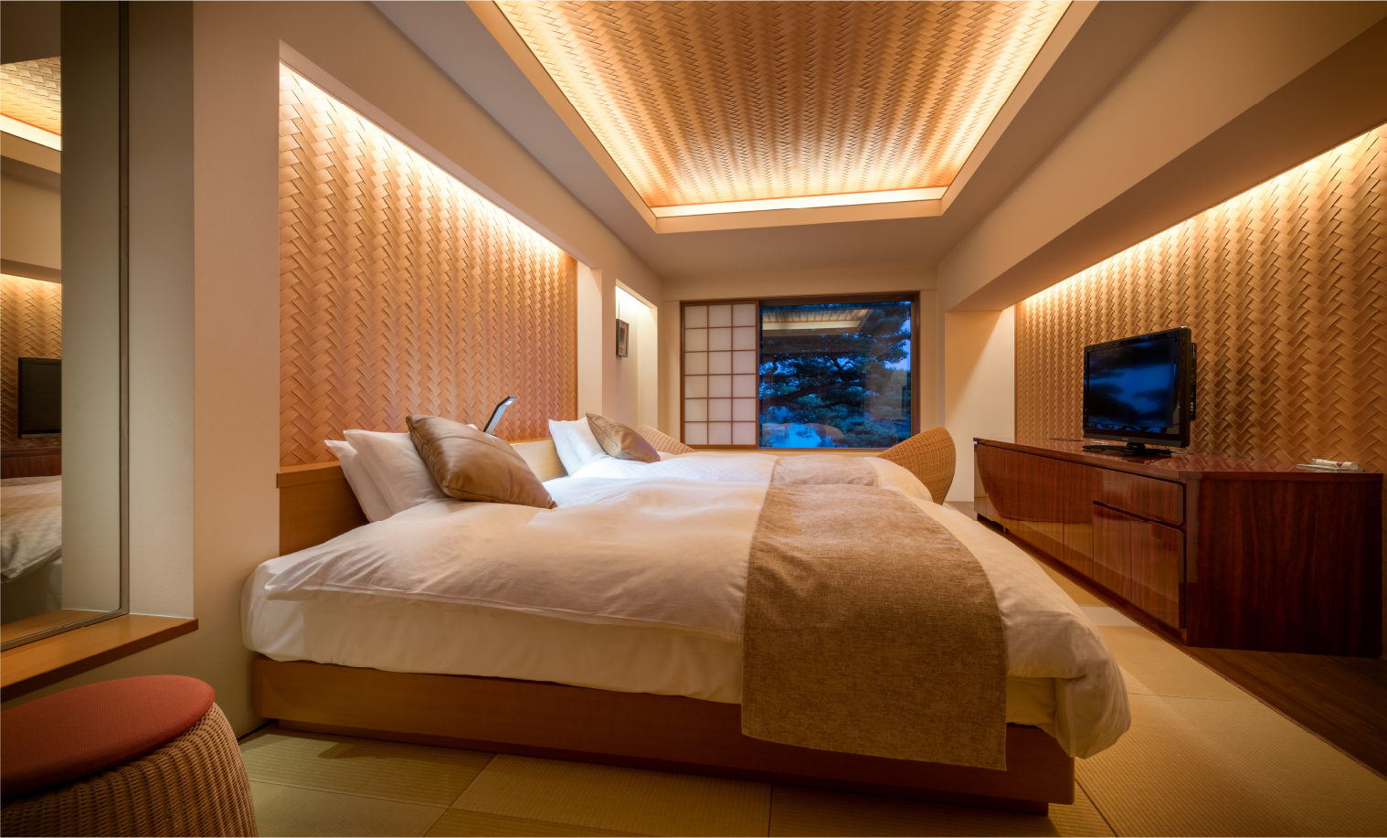 和室のしつらえの中に、ローベッドの寝具が用意されている「和モダン客室」です。