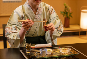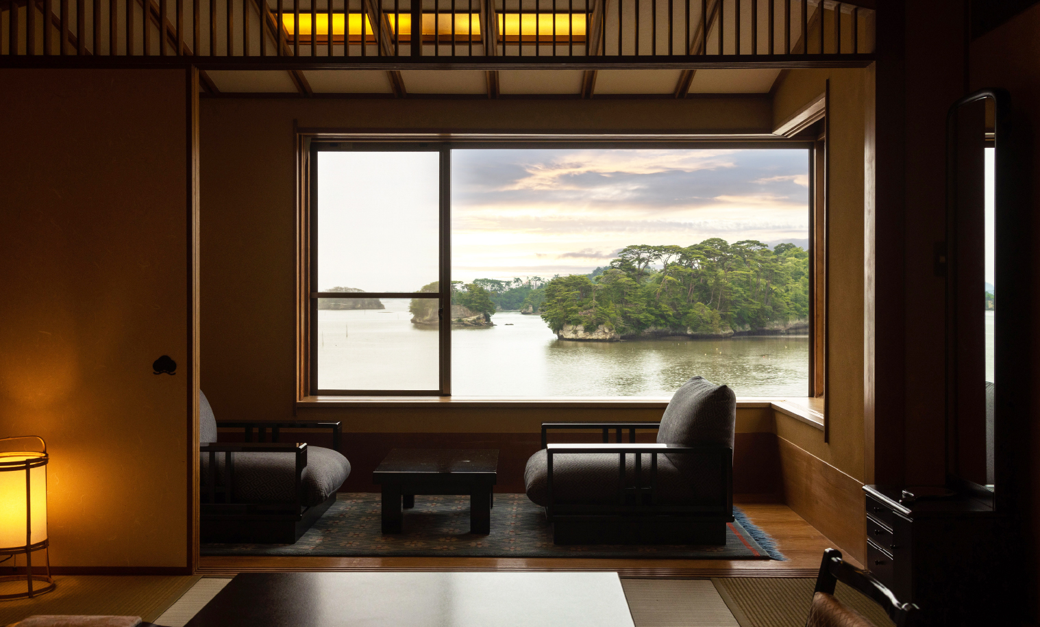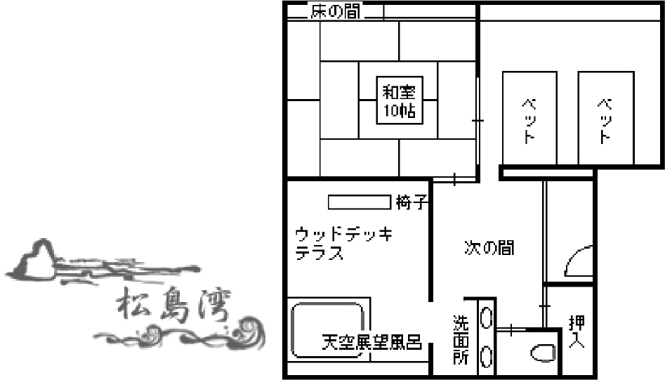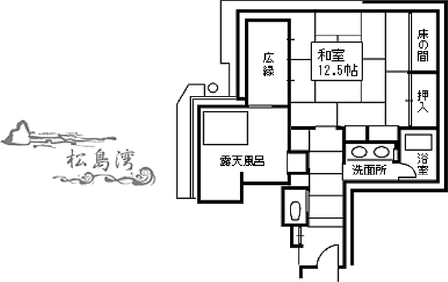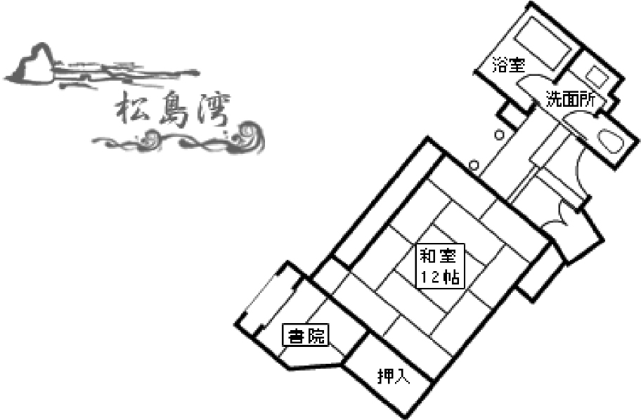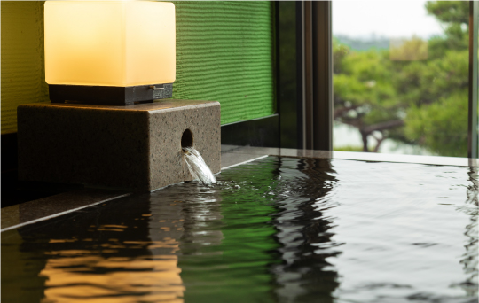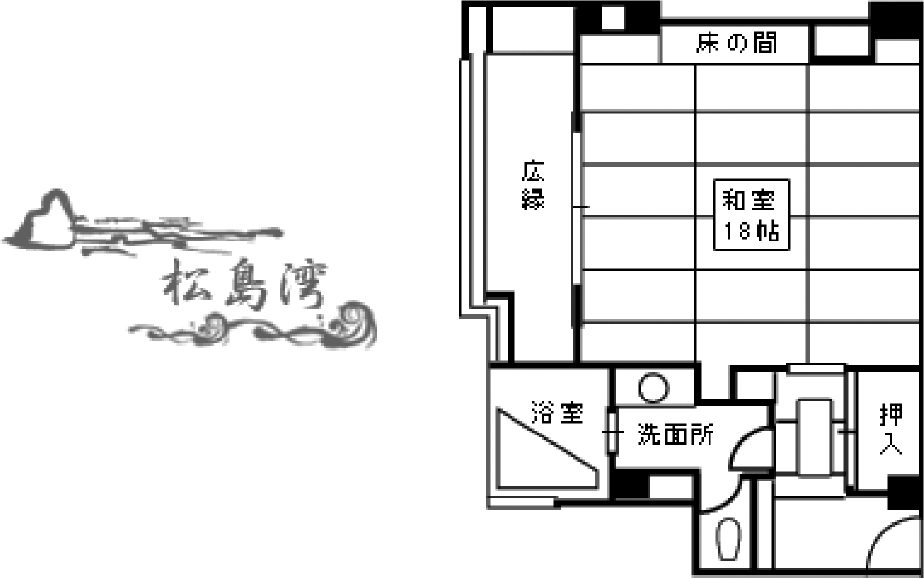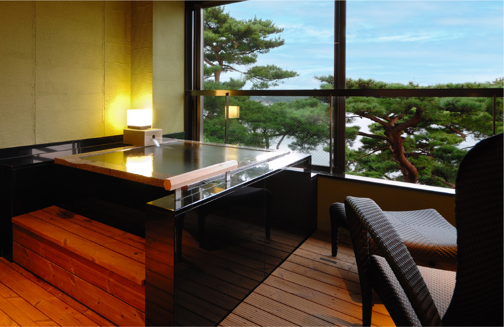 このお部屋の名は、かつて窓外に大きく広げていた松の古木より。趣のあるお風呂や、満月を模した窓を持つ書院。和建築の侘び寂びが感じられます。檜づくりの展望温泉から松島の景観もお楽しみいただけます。