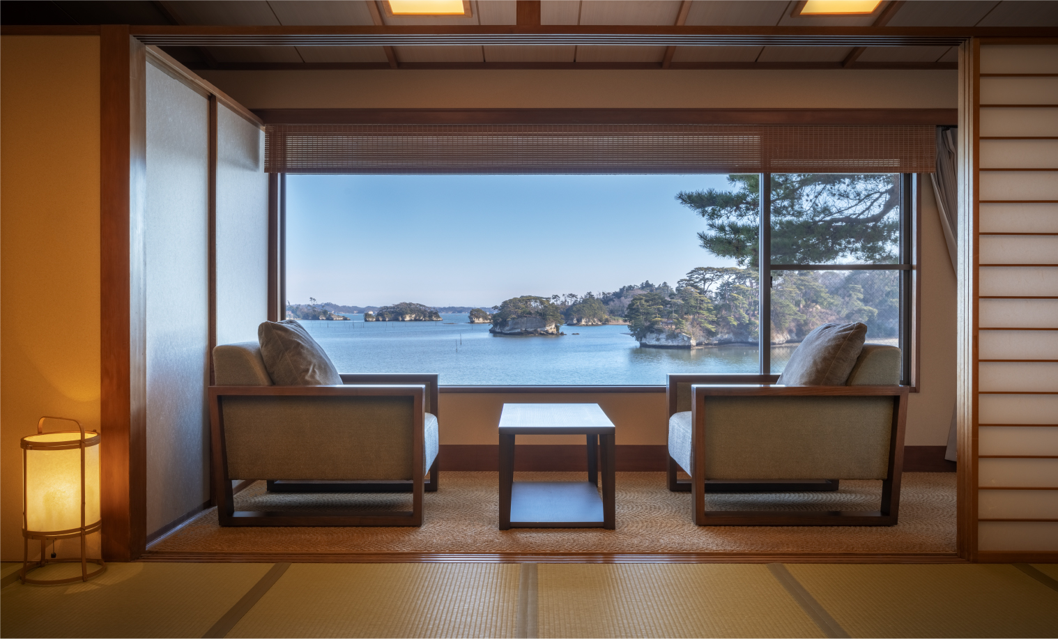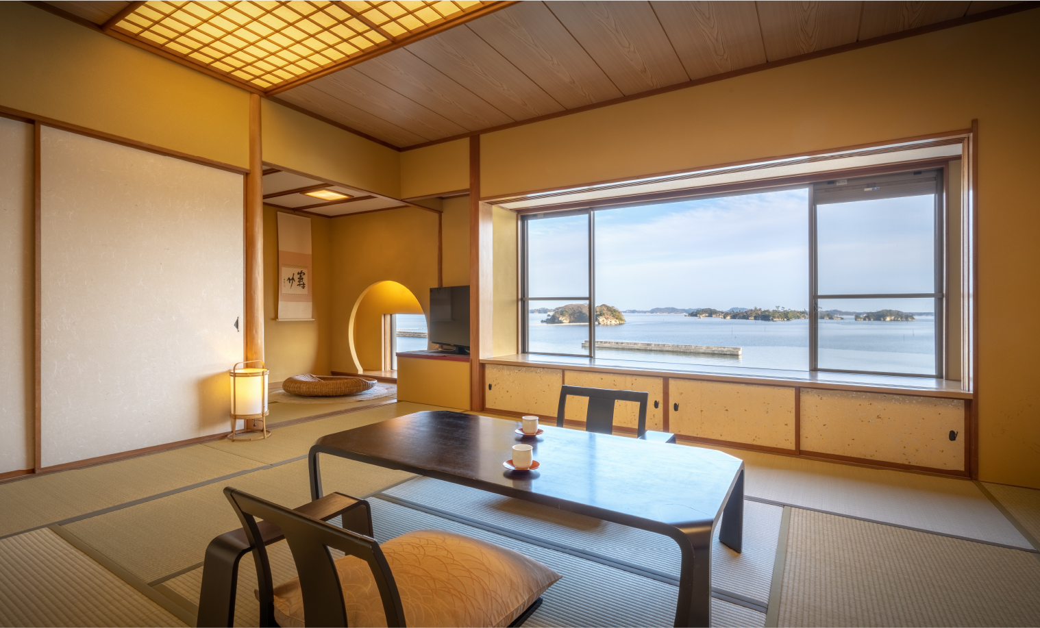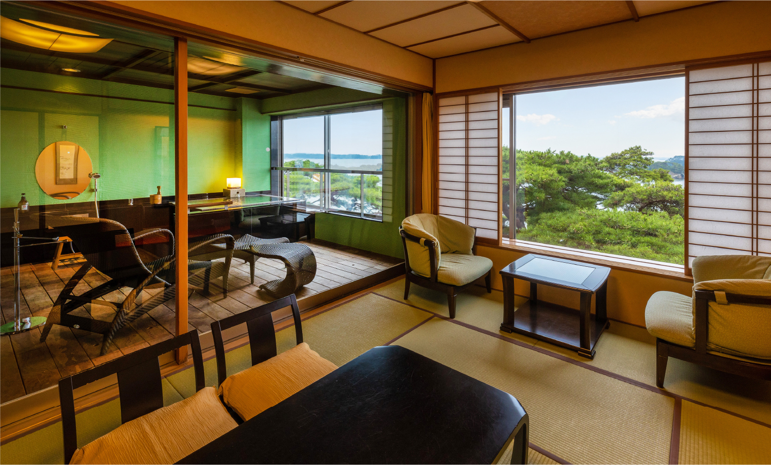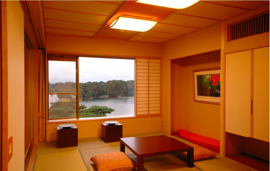 純和風“佗”を感じさせてくれるハイグレードの和室です。本間から、お風呂から、目の前の松ごしに松島の景色が眺められる人気の高い客室です。