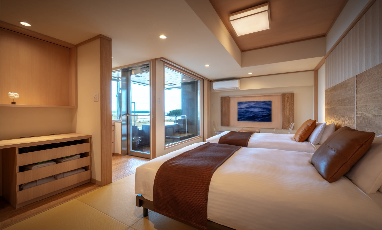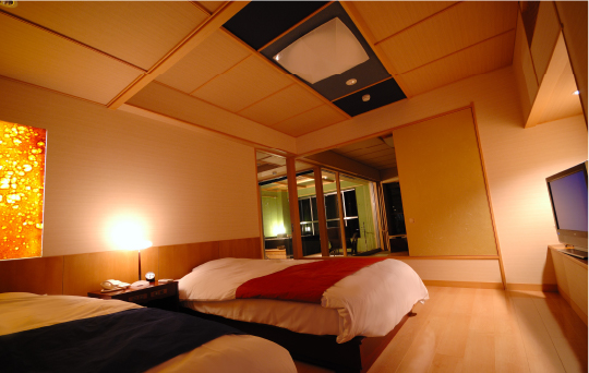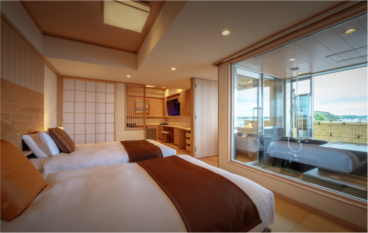 和室10帖+洋室(ツイン) / 福浦橋を見渡すパノラマビュー / 天空展望温泉 / ウッドデッキテラス / 寝室のベッドはシモンズ製 / 照度調整機能付照明 / 洗面台 / 温水洗浄便座付トイレ / 空気洗浄機 / ドライヤー / バスローブ / インターネット接続可能