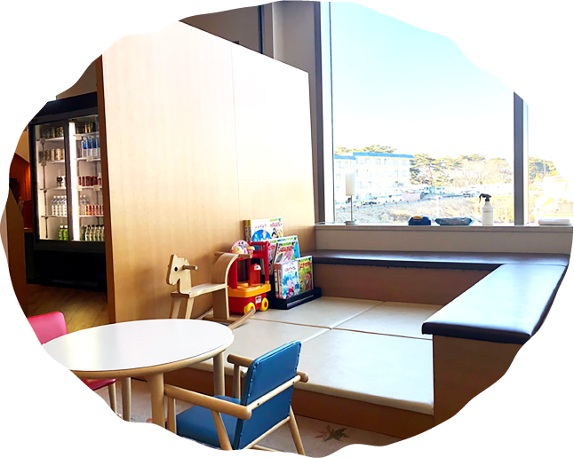 館内では、ベビーカーをはじめとしたグッズを貸し出しております。ロビーにはキッズスペースも設置しております。